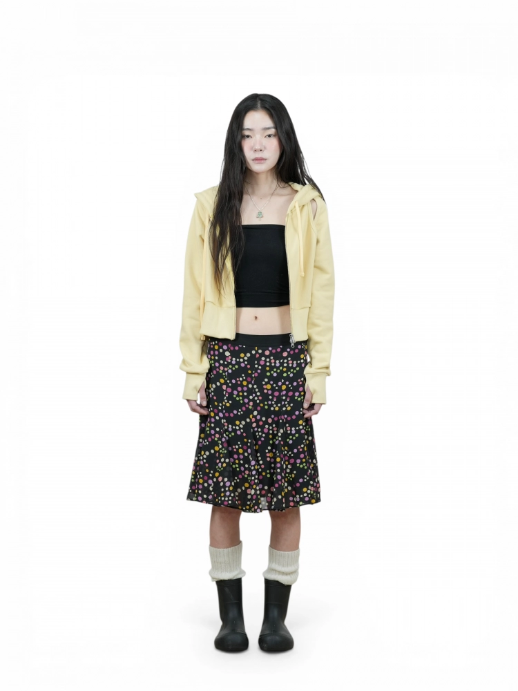 물이 흐르듯 흔들리는 밑단과 자유롭게 흩어진 도트 패턴이 어우러져, 빈티지한 감성과 해파리의 투명함을 쉬폰 원단에 담아낸 스커트입니다. 🪼
